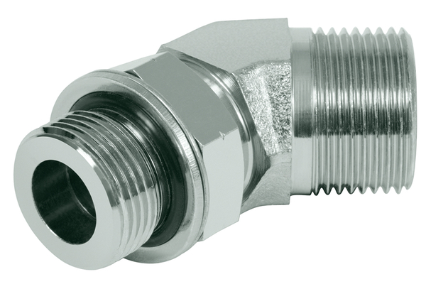 Beschrijving: Instelbare gebogen inschroefkoppeling 45°, ORFS - BSP, zacht afdichtend